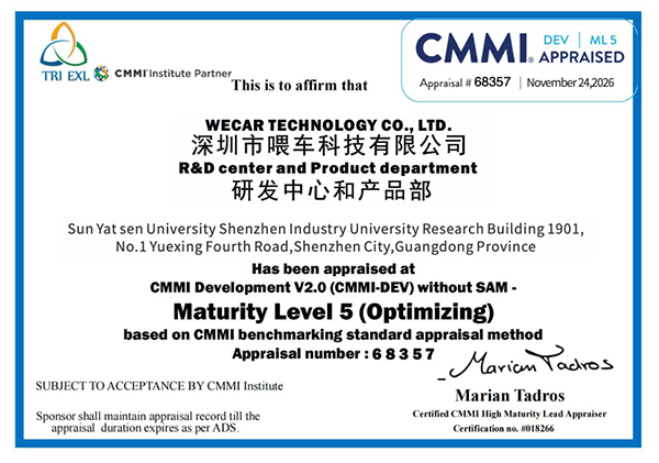 此次荣获CMMI5级认证,意味着喂车科技在研发管理体系、项目实施交付服务以及项目管理水平等方面均已达到国际领先水平,能够为客户提供更完善成熟的优质产品服务。