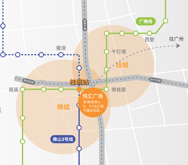 悦汇广场·南海位于佛山南海最繁华的商业地段,同时也是广佛线和佛山3号线交汇的桂城站上盖物业,周边聚集了大量的中高端品质家庭消费客群以及办公客群。项目自带TOD属性,无论是自驾、地铁、公交均能轻松抵达,为周边客群解锁轻松愉悦、自由有趣的城市生活方式。