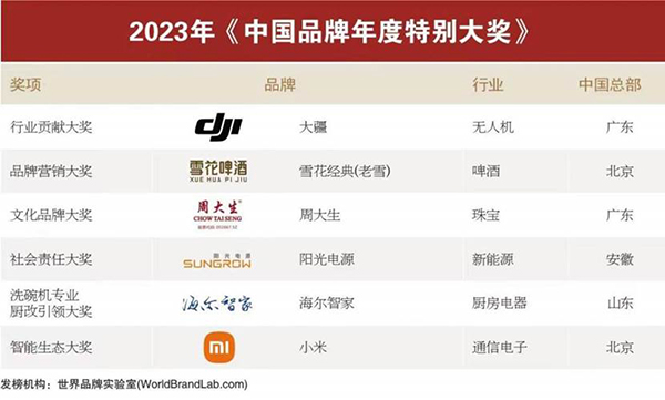 据了解,本届品牌年度特别大奖依据行业及企业特点,设立了“行业贡献大奖、品牌营销大奖、文化品牌大奖、社会责任大奖、厨改引领大奖和智能生态大奖”等6个特别奖项。大疆获得“2023年行业贡献大奖”;雪花经典获得“2023年品牌营销大奖”;周大生获得“2023年文化品牌大奖”;阳光电源获得“2023年社会责任大奖”;海尔智家获得“2023年洗碗机专业厨改引领大奖”;小米获得“2023年智能生态大奖”。