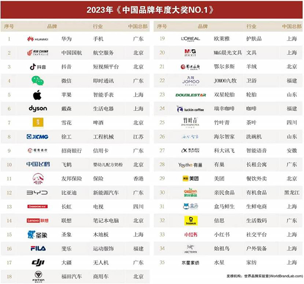 近日,世界品牌实验室评选的2023年“中国品牌年度大奖”揭晓。中国国航、徐工、雪花、海尔智家、长虹、圣象等35个品牌,入选“2023年中国品牌年度大奖”。