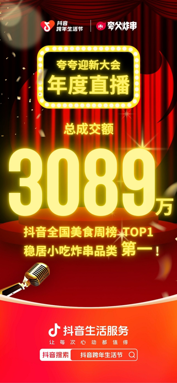 作为小吃炸串头部品牌,夸父联合抖音完成本次直播3天3089万成交额的战绩,背后依靠的是其日益强大的品牌势能与组织力,和抖音强大IP“跨年生活节”流量完美融合。