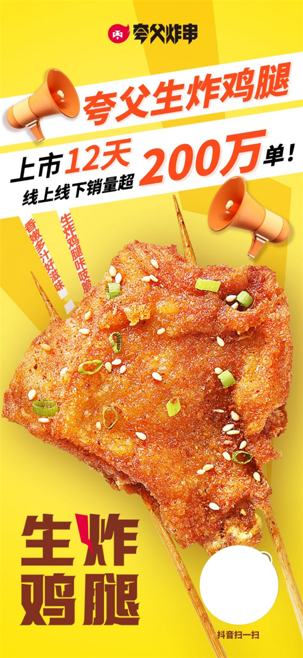 据了解,本次直播是夸父炸串与抖音联合策划的第二场直播活动,早在今年7月,夸父炸串就与抖音“畅吃聚会日”联合策划了品牌全国首场“夜市”主题沉浸式场景直播,并取得3天成交额1766万的成绩。时隔5个月后,夸父在首场直播的基础上进行了全方位迭代和升级,携年度重磅新品“生炸鸡腿”,成功刷新品牌直播成交额新记录。