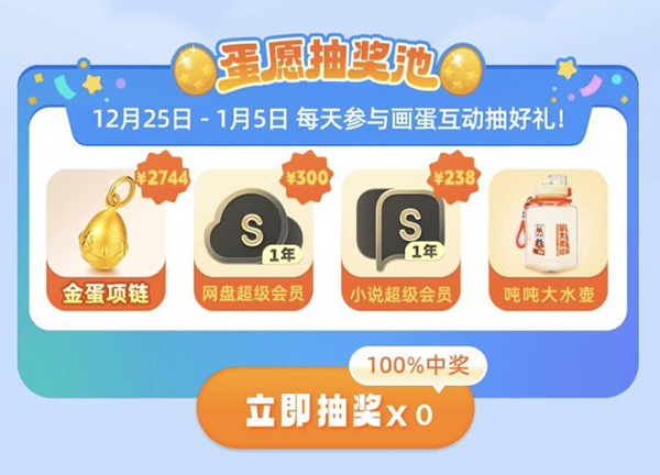 据悉,在12月25日到1月5日期间,用户上UC浏览器搜“画蛋许愿”即可参与活动,为2024甲辰龙年祈福,还有机会每天免费抽取纯金蛋大奖,以及UC网盘、UC小说年度会员、实物周边等惊喜福利奖品,中奖率100%。