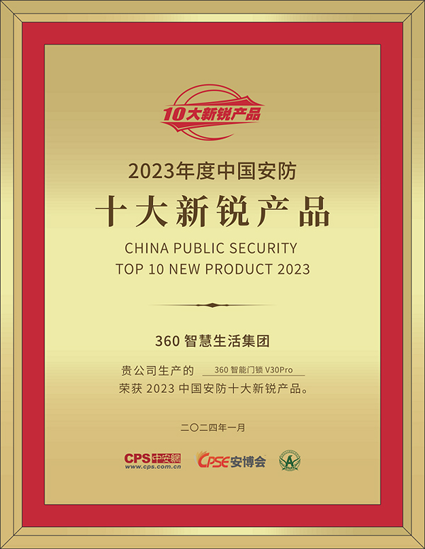 2024年1月8日,360智能门锁V30 Pro凭借技术上的锐意创新和厚积薄发,在深圳举办的“2024智慧物联与安防生态大会”上一举荣获2023年度“中国安防十大新锐产品奖”。