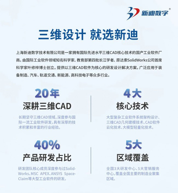 新迪数字是一家具有二十年三维CAD软件研发经验,拥有国际先进水平研发创新能力的国产三维CAD软件厂商,历经多年研发积累,在大型复杂工业软件系统架构设计、三维CAD几何建模技术、CAD软件云化技术、大模型轻量化技术领域拥有国内领先的自主核心技术。同时拥有图纸通、3DSOURCE零件库、3D轻量化引擎等多款SaaS工业云软件,为制造业提供一体化研发设计协同解决方案,受到市场广泛认可。