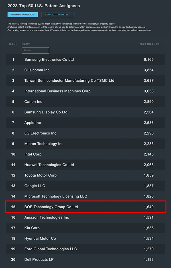 BOE(京东方)位列2023 IFI专利授权排行榜全球第15位