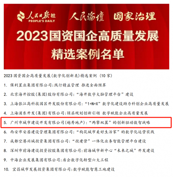 据了解,“2023国资国企高质量发展精选案例”征集1100余份经验与案例材料,相关课题组以创新性、科学性、有效性、普适性、影响力为主要考察指标初步筛选出50个案例,再经过专家评议等环节,优中选优,精选出30家案例作为“2023国资国企高质量发展精选案例”,越秀地产便是其中之一。这一荣誉不仅是对越秀地产在数字化转型方面的肯定,更是对其在推动行业创新发展方面所作贡献的认可。
