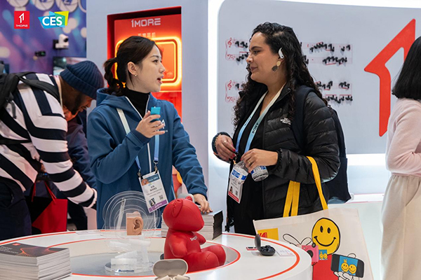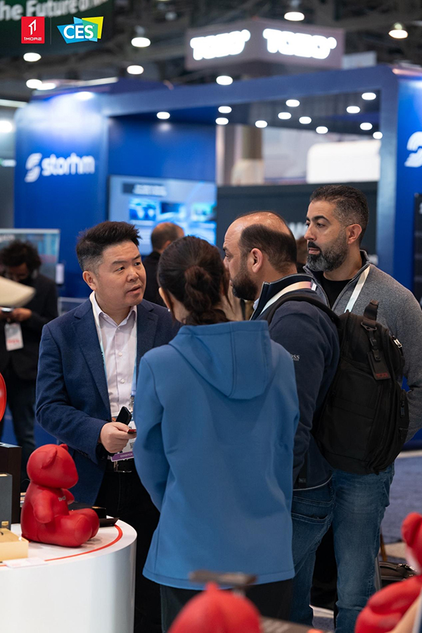 万魔科技合伙人兼CEO李传刚(左一)在2024CES现场与客户交流