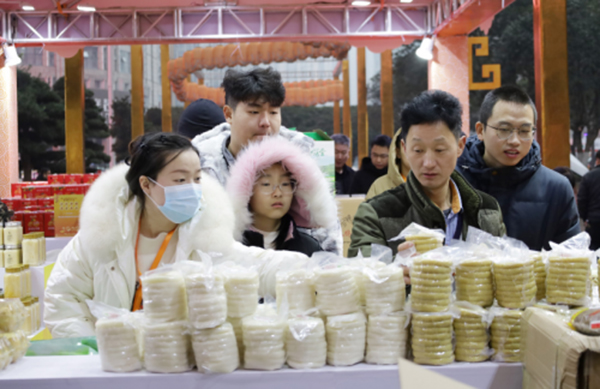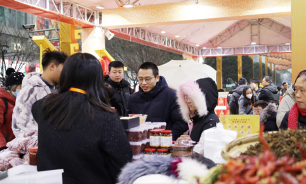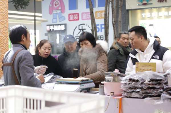临近春节,年味渐浓!1月26日在江北观音桥步行街一场颇具地方特色又别开生面的年货展销会吸引了市民目光,“山水珍馐秀外惠众”秀山消费帮扶年货节展销推介在江北开街。琳琅满目的年货调动起重庆人“打堆堆”看闹热的劲头,他们一边品尝一边给自家年货上新。
