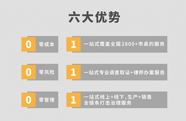知识产权安全是企业经济的核心要素!一旦知识产权安全受到威胁,如商标被假冒、专利被侵权、版权被盗用、商业秘密被窃取,这一切都会给企业带来无法估量的经济损失和声誉损害。经过近十年的技术研发与生态布局,安盾网布下令假冒、盗版和侵权胆战心惊的“天罗地网”。基于安盾庞大的资源网络,安盾网的服务优势体现在:一站式覆盖全国2800+市县的服务、一站式专业调查取证+律师办案服务、一站式线上+线下、生产+销售全链条打击治理服务,可为企业提供打击侵权/假冒、盗版多、快、准、狠的知识产权保护服务。
