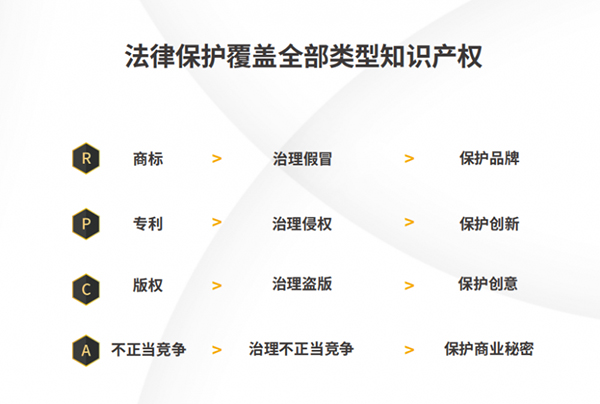 知识产权安全是企业竞争力的战略屏障!品牌商标是企业的承诺,是用户的购买理由。在“用户为王”的时代,谁拥有了核心用户,谁就拥有了市场的定价权。专利技术是企业的攻防武器,是行业的发展命脉。谁拥有最先进的技术,谁就能开拓蓝海享受红利。著作权和外观设计是产品的颜值。为产品穿上漂亮的“衣服”,才能夺人眼球、从同质化的竞争中脱颖而出。安盾网提供的法律保护覆盖全部类型知识产权,包括商标、专利、版权、不正当竞争等。