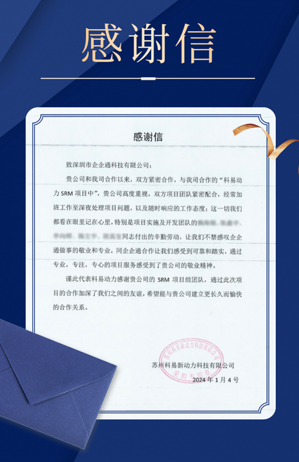 近日,企企通收到来自苏州科易新动力科技有限公司(以下简称“科易动力”)的感谢信,对企企通团队在SRM项目实施中所付出的努力表示感谢。