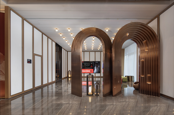 大堂入口处以泰山红门为灵感,闪回泰山溪门户。圆拱形成空间半分割隔断,引领攀登者进一步探索无边趣意。层层石磴出林杪,萦回百折青云梯,大堂空间以“玉皇穹顶”为核心切入点,使整个大堂的天花与墙面造型更具登穹顶泰山的十八盘阶梯神魂,致敬五岳之首的造化钟神秀。