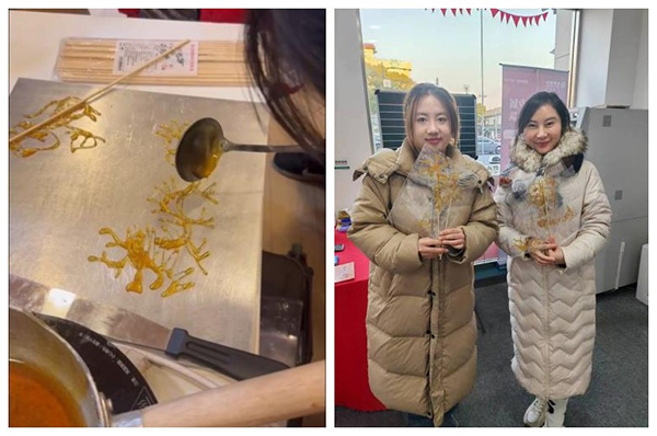 活动开始,糖画手艺老师首先给现场的嘉宾们详细介绍了糖画的历史,并示范了从熔糖到绘糖的全过程,一边做,一边讲解糖画的制作的要领:观察糖色、用力搅匀、趁热描糖。老师坐于摊前,取一勺热乎乎的“糖稀”,飞快的在摊面上挥洒,动作娴熟流畅,不一会栩栩如生的糖画作品诞生了。嘉宾们听得聚精会神,到了体验环节,嘉宾们个个跃跃欲试,想要体验制作糖画的奇妙过程。现场的嘉宾轻轻的舀一勺糖浆,在摊面上方,随着缕缕糖丝飘下,绘出晶莹剔透、造型生动的糖画,随后铲起糖浆,黏上竹签……大家都认真地完成每一步操作,糖画作品在嘉宾们的手中成型,她们拿着自己的糖画展示,边欣赏,边品尝,咬上一口酥脆香甜,脸上洋溢着开心的笑容。