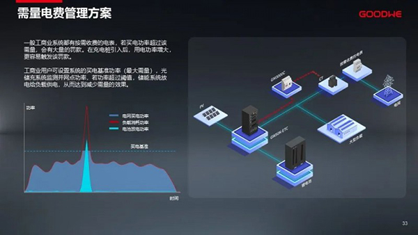 针对大家十分关心的工商业光储充场景,不仅仅是峰谷套利,他还特别提到了需量电费管理方案:一般工商业系统都有按需收费的电表,若买电功率超过该需量,会有大量的罚款。在充电桩引入后,用电功率增大,更容易触发该罚款。所以他指出,工商业用户可设置系统的买电基准功率(最大需量),光储充系统监测并网点功率,若功率超过阈值,储能系统放电给负载供电,从而达到减少需量的效果。
