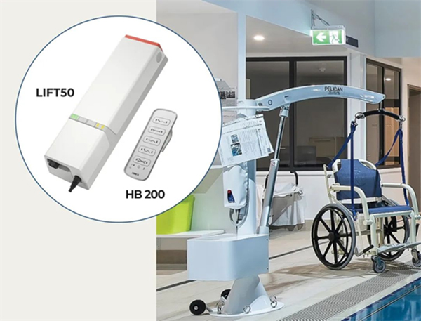 Pelican泳池升降机,安装于泳池或水疗池,借助其可调节臂使得残障人士也轻易进入。这依赖于其中的关键技术——力纳克的大推力、稳定电动推杆系统,通过系统精准的控制行程和推/拉力的变化,实现升降机的平稳高度调节。这一系列操作,用户可以自己通过手控器轻松操作,不需他人协助。