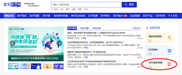 第一步:访问常笑医学网首页,点击顶部右侧的[论文查重/降重]