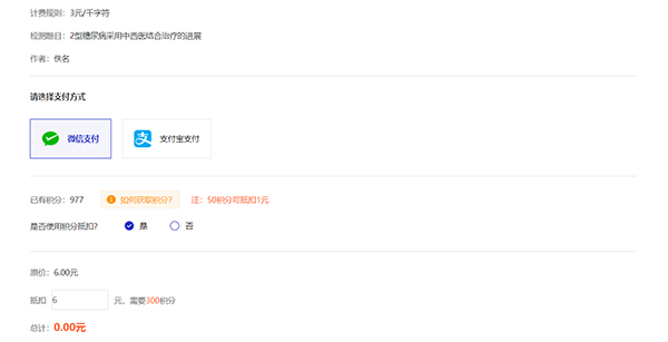 上传文档后会根据论文字数计算查重检测费用。常笑医学网为了鼓励更多用户使用论文检测服务,推出了积分抵扣服务。50积分即可抵扣1元,对于经常访问常笑医学网发布内容和参与互动的活跃用户来说是一个不错的福利。