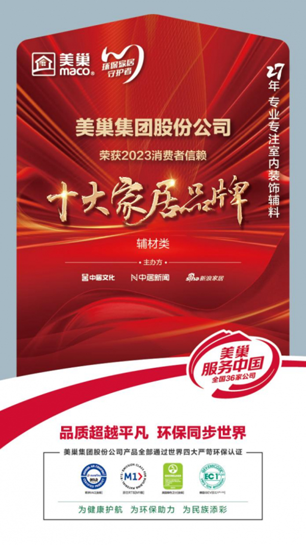 在信息化时代,消费者的实际体验感受和良好的口碑见证着品牌实力。近日,“2023消费者信赖十大家居品牌”榜单揭晓。本次评选由中居文化主办,以“家居行业高质量发展,扎实推进优质品牌建设”为宗旨,围绕当下众多家居品类、千余主流家居建材品牌,通过对产品品质、服务质量、消费口碑、品牌影响力四大维度进行专业评审,以此探究当下消费者心目中的口碑家居品牌,进一步提升家居行业发展的整体质量。美巢凭借世界水平的环保产品、美巢服务中国的市场布局、良好的消费者口碑及深耕多年的品牌影响力荣登“2023消费者信赖十大家居品牌”辅材类榜单,同时荣获“2023家居产业绿色低碳品牌大雁奖”。
