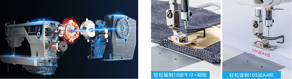 该机型搭载了九脑章鱼芯片和大力猿电机的AMH面料自适应系统,能够智能感知不同类型的面料,并以微秒级的速度做出响应。这一技术的创新为一线的服装生产车工带来最直接利益就是彻底告别手动调节,从而提供高效、及时、精准的缝纫效果。