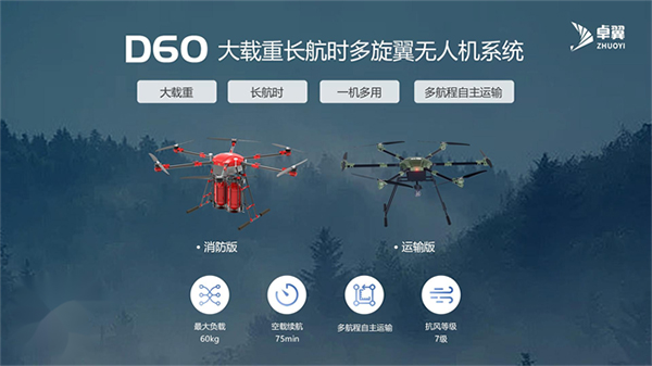利用卓翼智能D60多旋翼无人机进行森林火灾救援,高效助力森林消防打早灭小。卓翼D60大载重多旋翼无人机搭载的三光吊舱,可在林业防火巡查、灾后余火巡检中快速发现并定位火源,时为火灾扑救提供快速、精准的数据支撑和科学、有效的辅助决策;D60消防版配备了灭火专用的水基灭火弹投放器和干粉灭火球投放器,快速到达及时消灭,辅助支撑森林火灾扑救工作。
