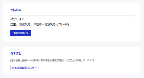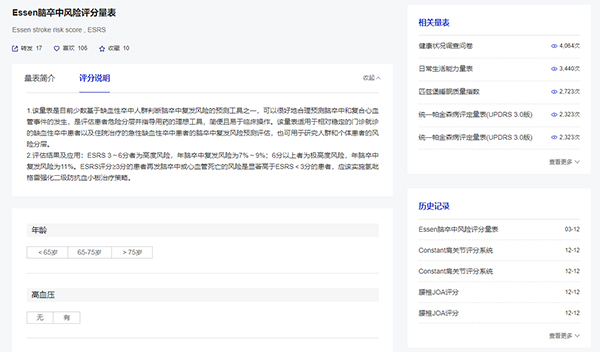 医生只需在常笑医学网选择相应的量表并点击立即使用,就可以在线进行评估,自动计算出患者的脑卒中风险评分,并给出相应的风险提示和建议。