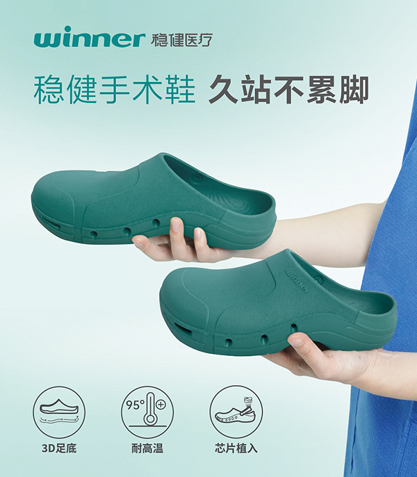 稳健医疗结合多年深耕医疗领域的经验积累以及创新能力,致力于为用户提供“一站式医用耗材解决方案”,其专业的手术室耗材、防护产品等收获广泛好评。而长期在手术工作中的医护人员仍有一些痛点,比如连续站立时间长达数小时乃至十数个小时,对医护人员的体力、耐力是巨大的考验,对鞋子的舒适度、耐用性与消毒的便利性有很高要求。在长期研发医疗产品的基础上,稳健医疗以人为本,解决痛点,充分考虑手术室医护人员的工作特性,在鞋类产品系列中开发了手术鞋系列。