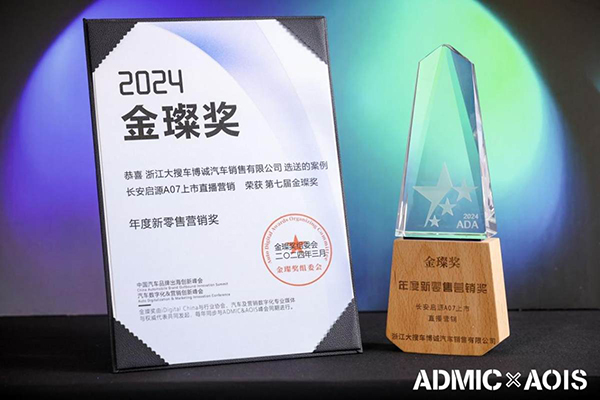 3月28日,第七届ADMIC汽车数字化&营销创新峰会在上海举行,活动同期举办2024年金璨奖颁奖典礼。经过来自国内外顶尖行业代表、数字营销服务机构与媒体、学术界专家的多轮专业评审,大搜车旗下一鹿新车直播中心凭借在“长安启源A07上市直播营销”中的亮眼表现斩获“年度新零售营销奖”。