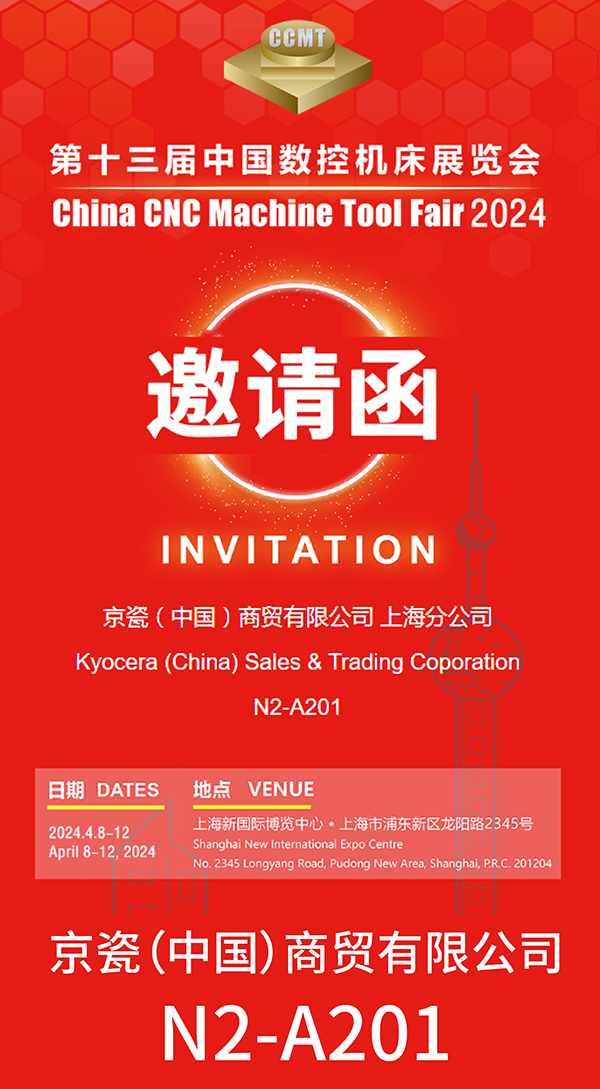 万物春生,芳菲盎然!2024年第十三届中国数控机床展览会(CCMT)将于4月8日-12日,以全新面貌在上海新国际博览中心盛大举办。京瓷将在这场机械加工领域久违的盛会上如期亮相N2-A201展台,届时将带来多款切削工具新品,诚邀莅临!