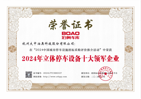 近日,在招投标品牌调研公示服务平台所举办的“2024中国城市停车设施招标采购评价推介”盛会上,杭州大中泊奥科技股份有限公司凭借其长达二十多年的深厚行业积累和强大的品牌影响力,一举斩获“2024年立体停车设备十大领军企业”、“2024政府采购立体停车设备十大品牌”、“2024年高端智能立体停车设备十大品牌”以及“2024年立体停车设备维保售后十佳运营服务商”等多项荣誉,再次确立了在国内乃至国际市场立体停车行业的领军地位。