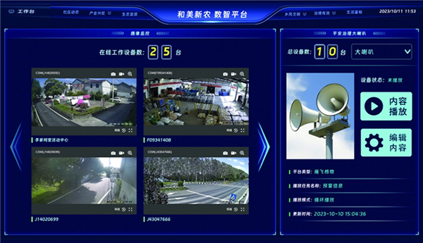 通过大喇叭喊话功能,成为农民群众了解村务的重要渠道。随时向村民传递市场和科技致富信息,传播涉农知识、法律、法规知识,应对农村突发事件;同时打造数字乡村平台“平安防护”新模式,当地民警、村委、村民直接通过可视化大屏或数字乡村微信小程序,查看本村的5G摄像头,形成三方共同治理新模式,通过高效的动态安防产品,提高乡村综治能力,让村民生活变得更加便捷安全。目前,已在新农社区部署了大喇叭10个、5G摄像头25个,实现了联通数村平台村务管理一张图展示。