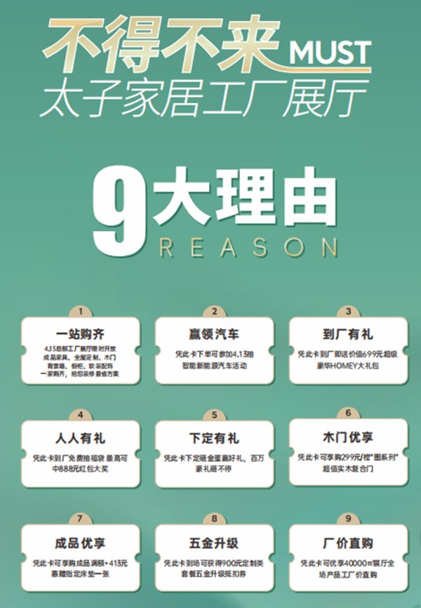 至4月13日,参加“太子家居智家生活季”超级工厂团购活动,现场持“智家卡”到厂享9大权益。