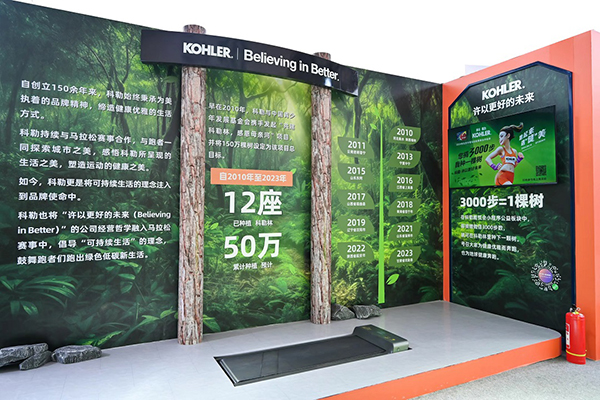 作为2024年北京半程马拉松赛事官方合作伙伴,科勒在此次线下赛后体验区为跑者打造沉浸式互动体验,现场设置嵌入式走步机,借此鼓励选手们在科勒【雅悦会】小程序参与“您捐3000步,我种一棵树”公益活动,每日可通过捐赠3000微信步数在科勒林中认种一棵树,领取由科勒携手中国青少年发展基金会共同提供的认种证书,以实践助力低碳、可持续的未来!