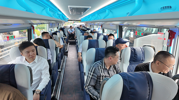 新V系客车究竟怎么样?在实车体验环节,与会嘉宾代表们先后查看了车辆内部设计和制造工艺,并亲身感受了新V系高铁遮阳帘、车内氛围灯、智能座舱带来的驾乘体验升级,给出了自己的真实评价。来自重庆龙华客运公司的负责人陈明建在参观了新V系客车后主动承担起“司机”一职,开车载着二十余位嘉宾代表们驶出会场,沿着重庆美丽的北滨路缓缓行驶、欣赏一路繁华景色。既是龙华的经营车主,又是资深大巴车驾驶员的陈明建熟练地操控着方向盘并表示,“可以,开着很舒适。”