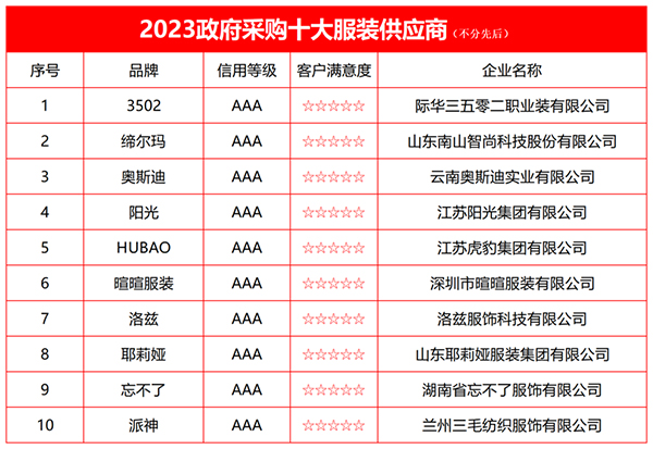 “2023政府采购十大服装供应商”榜单的发布,无疑为整个服装行业注入了新的活力,也为政府采购市场需求各方提供了更加可靠的依据参考。随着政府采购需求升级和采购制度不断完善,想在激烈的市场竞争中立于不败之地,企业必须始终坚持创新驱动、质量为本的发展理念,不断提高产品质量和服务水平,提升自身的核心竞争力和品牌影响力,为政府采购市场和采购单位带来更加美好的着装体验。具体名单如下: