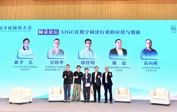 圆桌讨论环节中,围绕“AIGC在数字阅读行业的应用与创新”热点话题,中国传媒大学出版学院编辑出版系主任、教授吴炜华,斑马儿童研究院院长修佳明,同方知网总经理张宏伟,中国移动咪咕数媒首席技术官苗向彬多位行业代表就展开深入探讨。
