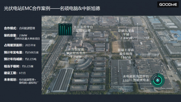 微软也一直致力于运用在人工智能、数据科学和数字化转型等领域的技术积累,帮助全球各地的合作伙伴减少碳足迹,打造绿色供应链。名硕电脑作为微软在中国最大的供应链企业,于2023年起开始建设分布式光伏电站,该电站由固德威旗下子公司中新旭德投资建设,装机容量23MW,预计年发电量约2500万度,年均减碳约2.2万吨。