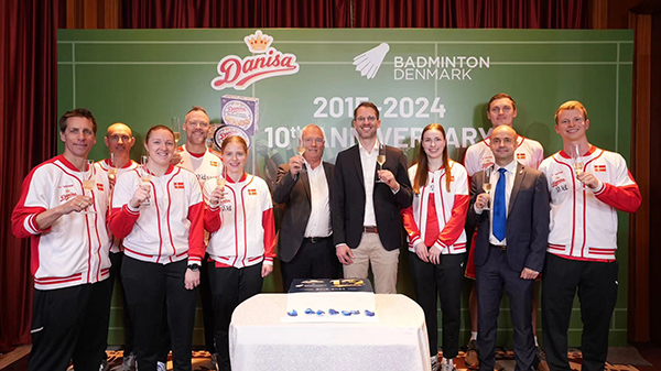 4月25日,双方在成都特别举办了“Danisa皇冠丹麦曲奇与丹麦国家羽毛球队合作十周年”庆祝活动。丹麦丹尼诗特色食品有限公司CEO Erik Bresling先生、丹麦国家羽毛球队总教练Kenneth Johansson先生、主席Kristian Pinderup Langbak先生,球队CEO Kristian Pihl先生、总经理Jesper先生,以及球员代表安赛龙、阿斯特鲁普、莱恩·杰克斯菲德等出席活动,共同举杯庆贺并在十周年专属球衣上签字留念。