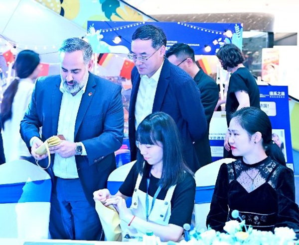 德国驻成都总领馆总领事 Aron Mir Haschemi先生与华达利中国区总裁刘峥嵘先生现场体验Domicil牛皮手工
