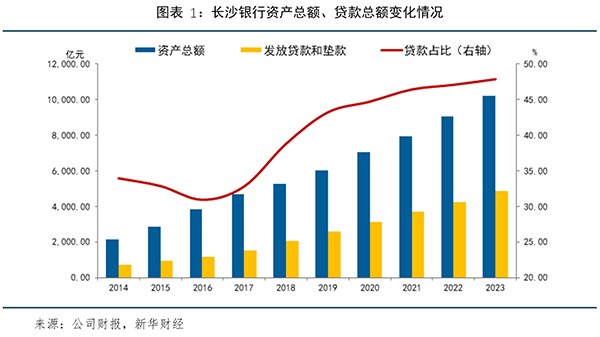 规模破万亿后持续增长,资产总额达到10613.03亿元。2023年,长沙银行资产规模突破一万亿元,提前两年实现“万亿”资产的战略目标,正式成为湖南首家、A股第八家万亿级城商行。数据显示,截至2023年末,长沙银行资产总额达到10200.33亿元,同比增长12.74%;其中,发放贷款和垫款本金总额达到4883.91亿元,同比增长14.64%,发放贷款和垫款余额占资产总额的比重从上年末的45.62%提高到46.45%。今年一季度,该行经营规模持续增长,季末资产总额达到10613.03亿元,较年初增长4.05%;其中,发放贷款及垫款本金总额5223.17亿元,较年初增长6.95%,贷款总额占资产总额的比重提升至49.21%,信贷本源业务驱动规模增长的特征进一步凸显。