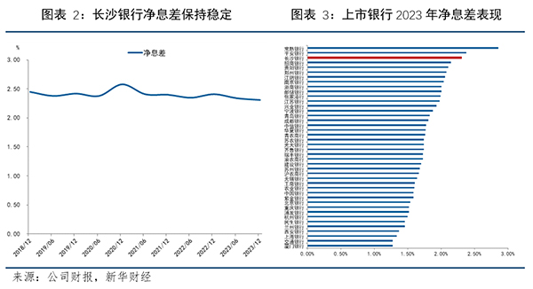 经营效益持续向好,保持较快业绩增速。2023年,长沙银行实现营业收入248.03亿元,同比增长8.46%;归属于母公司股东的净利润74.63亿元,同比增长9.57%。2024年一季度,实现营业收入65.61亿元,同比增长7.89%;归属于母公司股东的净利润20.93亿元,同比增长5.75%。对比来看,长沙银行继续保持高于行业整体水平的业绩增速,主要盈利指标保持优异水平。2023年其净利息收益率2.31%,加权平均净资产收益率12.50%,均处在行业前列。