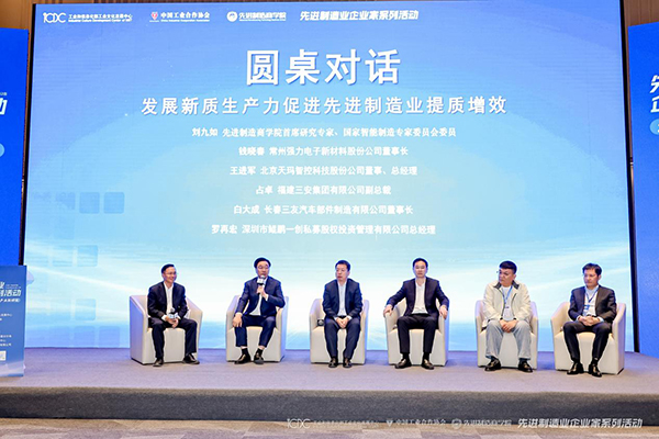企业家圆桌会议亦同期顺利进行。常州强力电子新材料股份公司董事长钱晓春,北京天玛智控科技股份公司董事、总经理王进军,福建三安集团有限公司副总裁占卓,长春三友汽车部件制造公司董事长、总经理白大成,深圳市鲲鹏一创私募股权投资管理有限公司总经理罗再宏围绕“发展新质生产力,促进先进制造业提质增效”话题展开探讨,国家智能制造专家委员会委员、工业和信息化部电子科技委政策组副组长刘九如主持了圆桌对话。