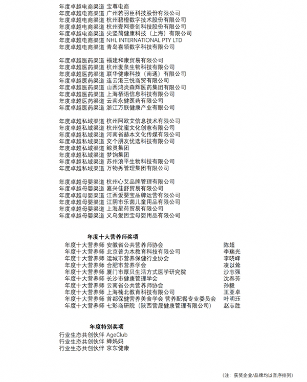 历时一个月面向全行业公开征集申报资料,依据六大维度综合评审体系,由专委会评审打分评选出年度影响力品牌奖、年度创新产品奖、年度卓越经销商、年度卓越电商渠道、年度卓越医药渠道、年度卓越私域渠道、年度卓越母婴渠道,并首次设置十大营养师奖项,特别奖项:行业生态共创伙伴,九大奖项已于当晚全部揭晓!