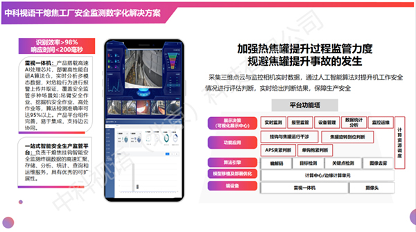 中科视语焦化工厂安全监测数智化解决方案,具备“一站式集中管理、信息流完整、系统灵活可扩展、人工监看强度低、识别准确率大于98%、响应时间小于200ms、连续运行720h”等核心特点,该方案旨在助力制造企业客户快速搭建数智化风险防范系统,有效构建焦化工厂安全的“免疫系统”,实现风险状态实时感知和数据驱动的闭环管理,确保安全生产和作业人员生命安全,加强对提升过程的检测监管,规避异常事件的发生,形成工厂安全的“智慧大脑”。目前,中科视语焦化工厂安全监测数智化解决方案在河南金马中东能源有限公司落地投入应用。