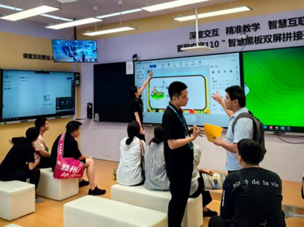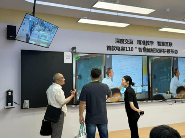 在智慧教室场景中,安道教育展示首款电容110寸双屏拼接形态的智慧黑板Q系列,可实现多种教学模式的切换,适合各类教室应用需求,其高度集成的功能特色受到众多参展者的青睐。