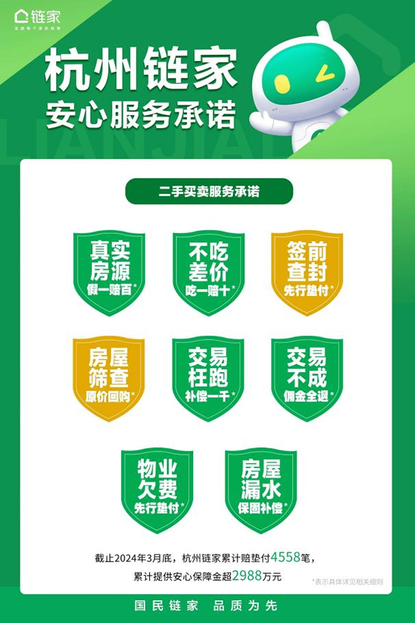 “房屋漏水,保固补偿”只是链家安心服务承诺其中一项。截至2024年3月底,杭州链家所有安心服务承诺累计赔垫付4558笔,2988.97万元。每一次承诺的兑现,都是对客户安心消费体验的提升,也是对服务品质提出更高的诉求。
