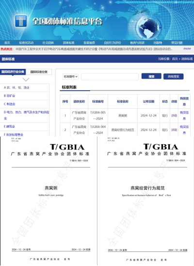 历经5个月的努力,两项团体标准严格按照《国家标准化管理委员会、民政部关于印发<团体标准管理规定>的通知》(国标委联〔2019〕1号)和《广东省燕窝产业协会团体标准制定程序》的有关规定程序,完成了申请、立项、起草、征求意见、审查、批准等工作,并在全国团体标准信息平台正式发布。