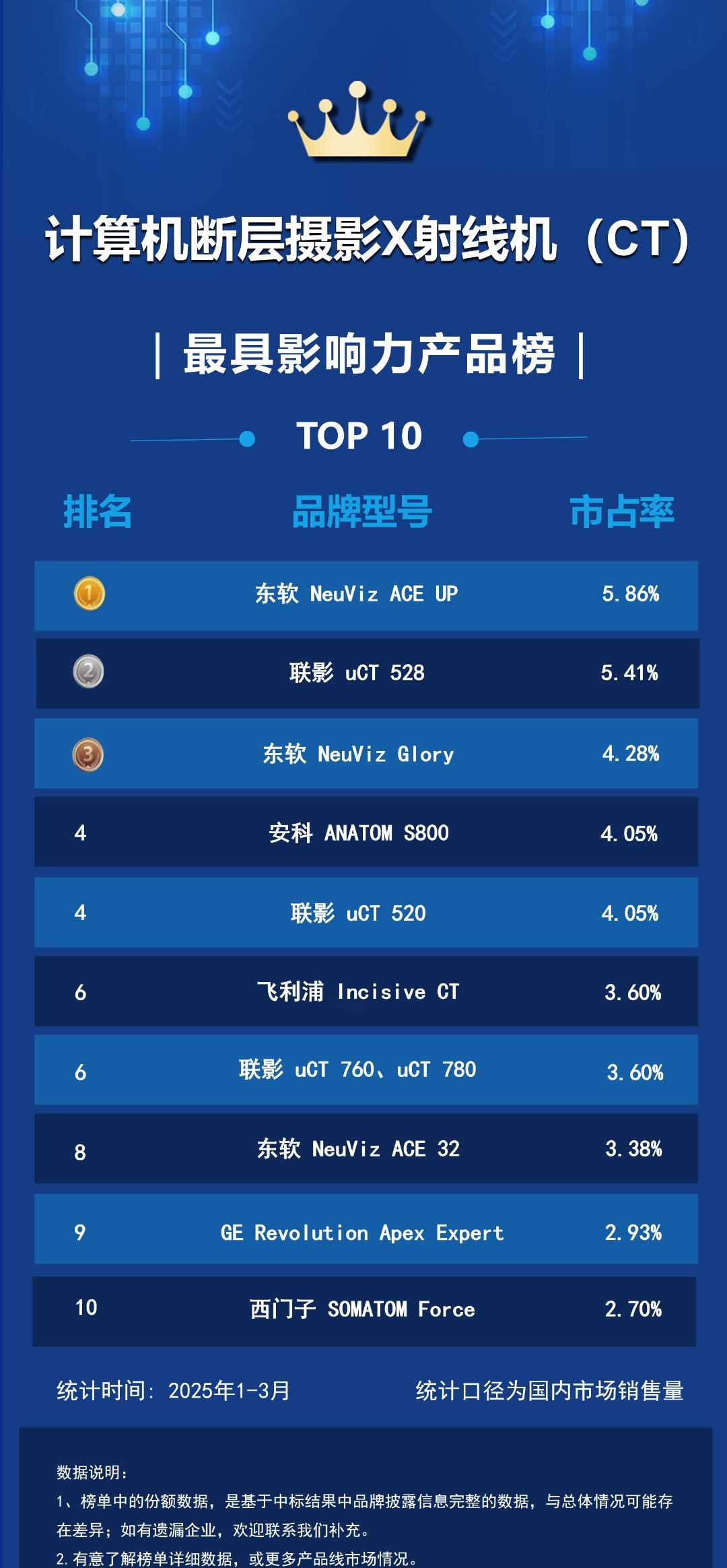 因此,众成数科统计2025年第一季度各型号CT的市场表现后发现,NeuViz ACE系列、NeuViz Glory等型号纷纷登榜,NeuViz ACE UP更是位居销量榜首,单品市占率达5.86%,市场认可度极高。