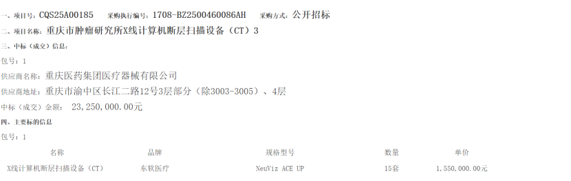 例如,在不久前开标的重庆市肿瘤研究所X线计算机断层扫描设备采购项目,东软医疗旗下NeuViz ACE UP成功包揽采购包3中的15套CT。3月份开标的渭南市县域医共体设备更新建设项目,NeuViz ACE 128成功包揽采购包9的1套CT。