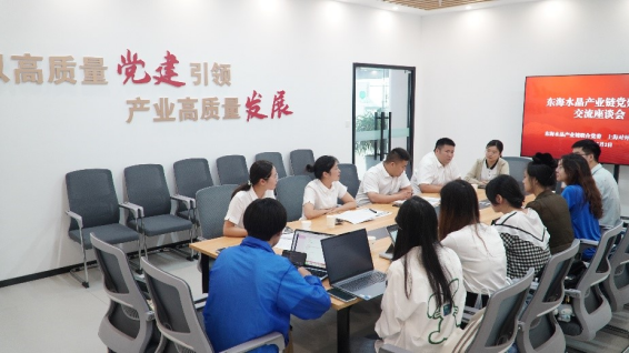 在东海水晶产业链党群综合服务中心,调研团队与相关工作人员面对面交流,深入了解如何将党的组织优势有效转化为产业发展优势。该中心以“七彩晶链”工作机制为抓手,整合物业服务、电商培训、知识产权保护等多项职能,为产业链上下游企业提供“一站式”服务平台。